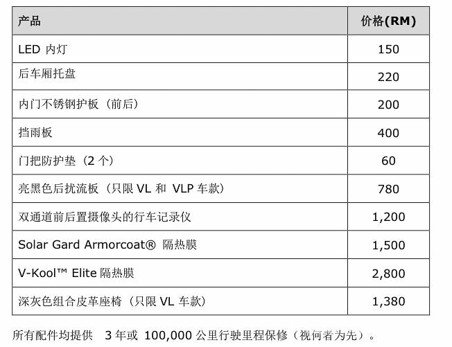 着重外观的客户则可选择价值RM 950外观装饰配套 ( Exterior Styling Package ) 。这个配件配套含挡雨板、碳纤维花纹饰面门把防护垫(2个),另外,VL 和 VLP 两个车款还可获得亮黑色后扰流板。由於后扰流板是 VLT 车款的标配,所以 VLT 车款的的车主,只需区区RM 350便可选购这个配套。