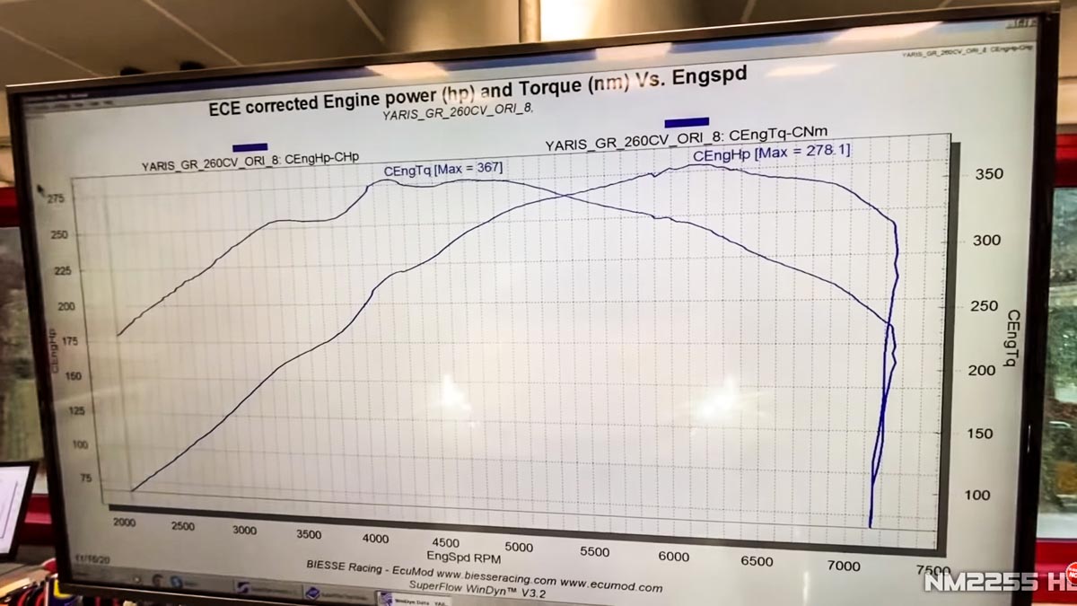 根据 Toyota 所公布的官方数据,Toyota GR Yaris 可在6,000转产生268 Hp的最大马力,峰值扭力则为370 Nm,匹配 6速 iMT 智能手排变速箱以及 GR Four 性能四驱系统,极速可达到230 km/h;虽然原厂并没有公布官方的0-100成绩,但是不久前根据国外媒体的实际测试,这款三缸小钢炮在5.4秒之内就可破百,实力绝对不容小觑!而如今远在意大利就有 GR Yaris 的车主将车子送上马力机进行测试,值得一提的是欧洲版的 GR Yaris 在输出上稍微是比日规版还要稍低的,分别为257 Hp及360 Nm。