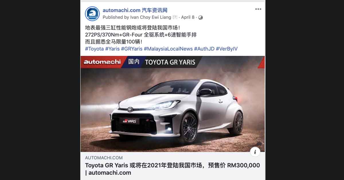 在4月8日的时候,我们的朋友马来网站 Careta.my 报道了 GR Yaris 即将登陆我国的消息,因此我们也做出了这一个报道。之前 Toyota 曾经表示 GR Yaris 并不像之前的 Yaris GRMN 一样是限量发售,而是全球车型,所以会引进我国是合理的,在12月17日,这款新车就登陆我国了,售价RM299,000,和之前预计的RM 300,000相去不远。