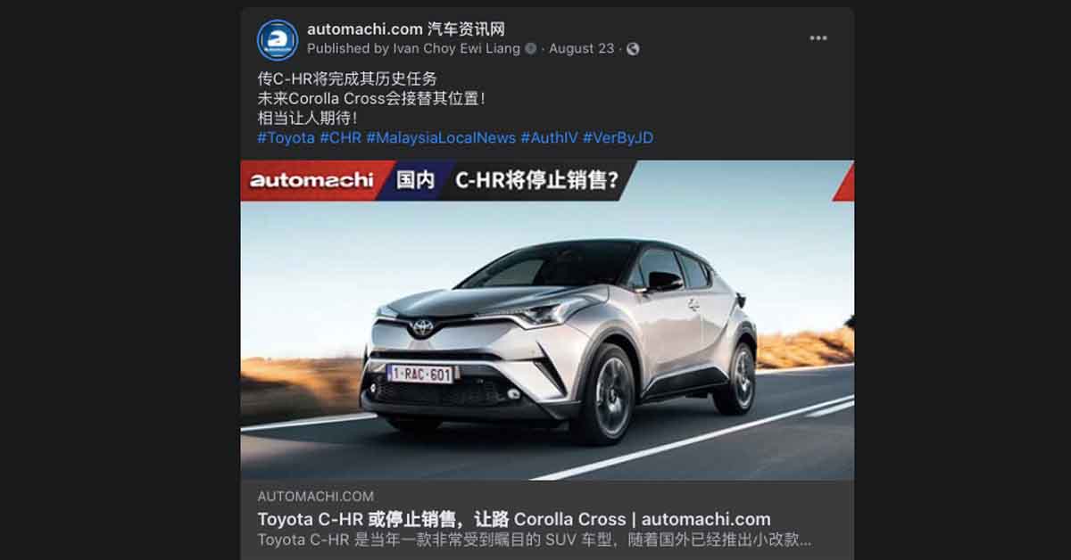 2020年8月23日:我国的 Toyota C-HR 可能会停止销售