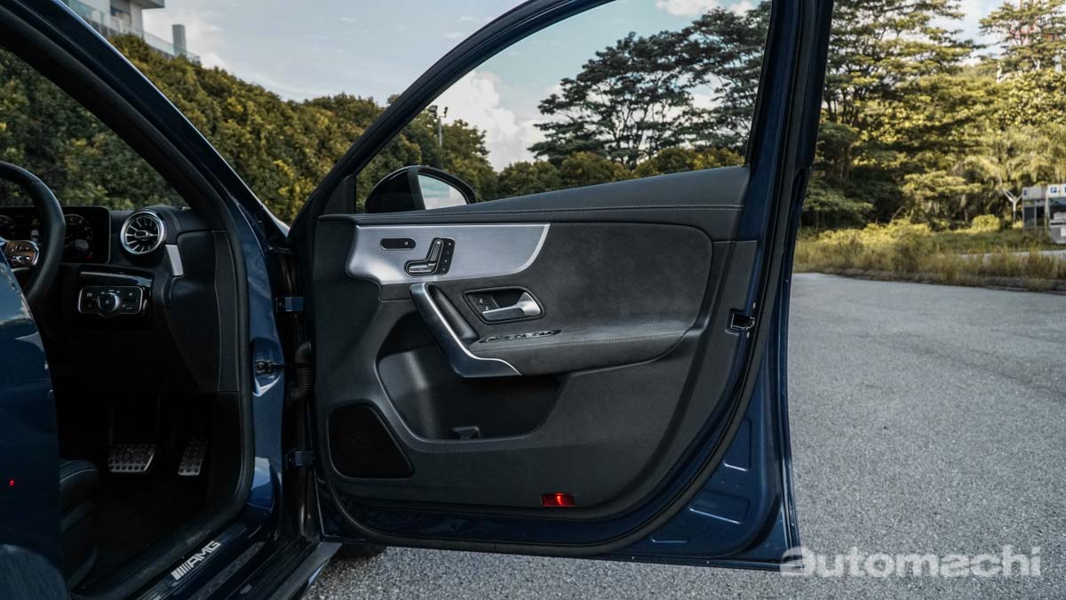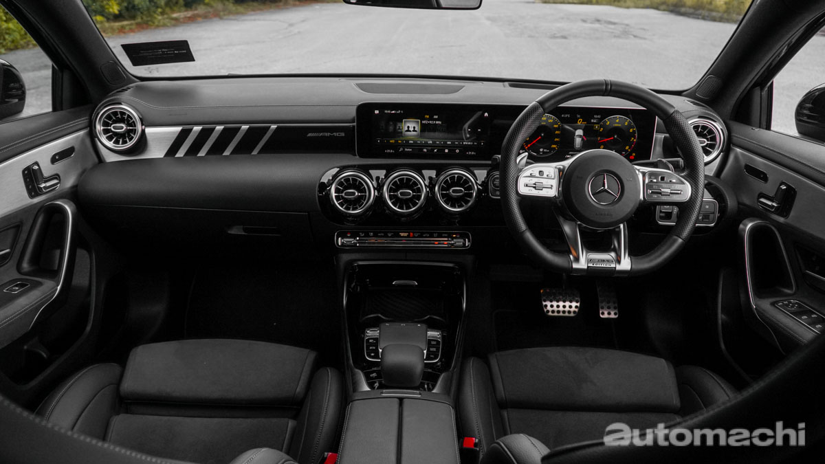 内装方面,虽然在基本的设计上面和普通版本的 A Class 很接近,但是在仔细观察的话还是有很多改变,例如在 A35 Hatchback 上面换上了 AMG 的方向盘,另外在中控台以及门板上面也采用了大量的麂皮材质,一来提升视觉感受,二来增加车辆的运动感,另外在 A35 Hatchback 上面还有一个可以显示引擎转速的全彩抬头显示器,这个抬头显示器可以显示的资讯确实很丰富,所以 A35 Hatchback 除了运动感之外,科技感受也非常强烈。