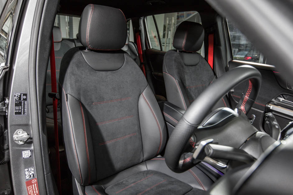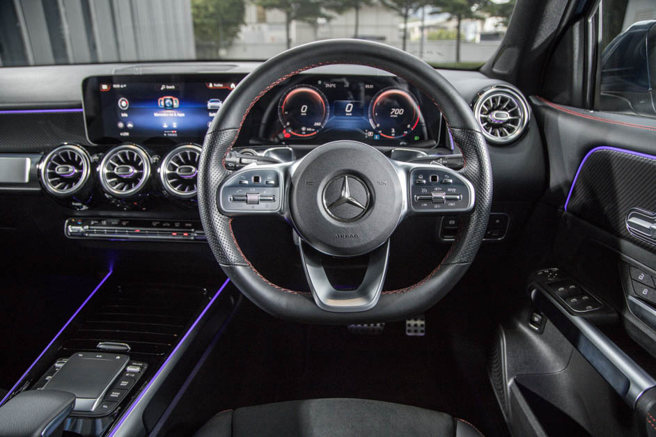 至于内装部分,GLB 全车系都备有7寸全液晶仪表盘 + 7寸中控车机的一体式大屏、涡轮式空调出风口设计、花俏的环舱氛围灯、位于中央扶手处的 Touchpad 手触控制器以及新一代的家族式方向盘等等。但值得一提的是,GLB250 还具备了 AMG 的方向盘,AMG 的运动座椅以及 AMG 的许多配件,内装质感以及战斗气息更为动感!