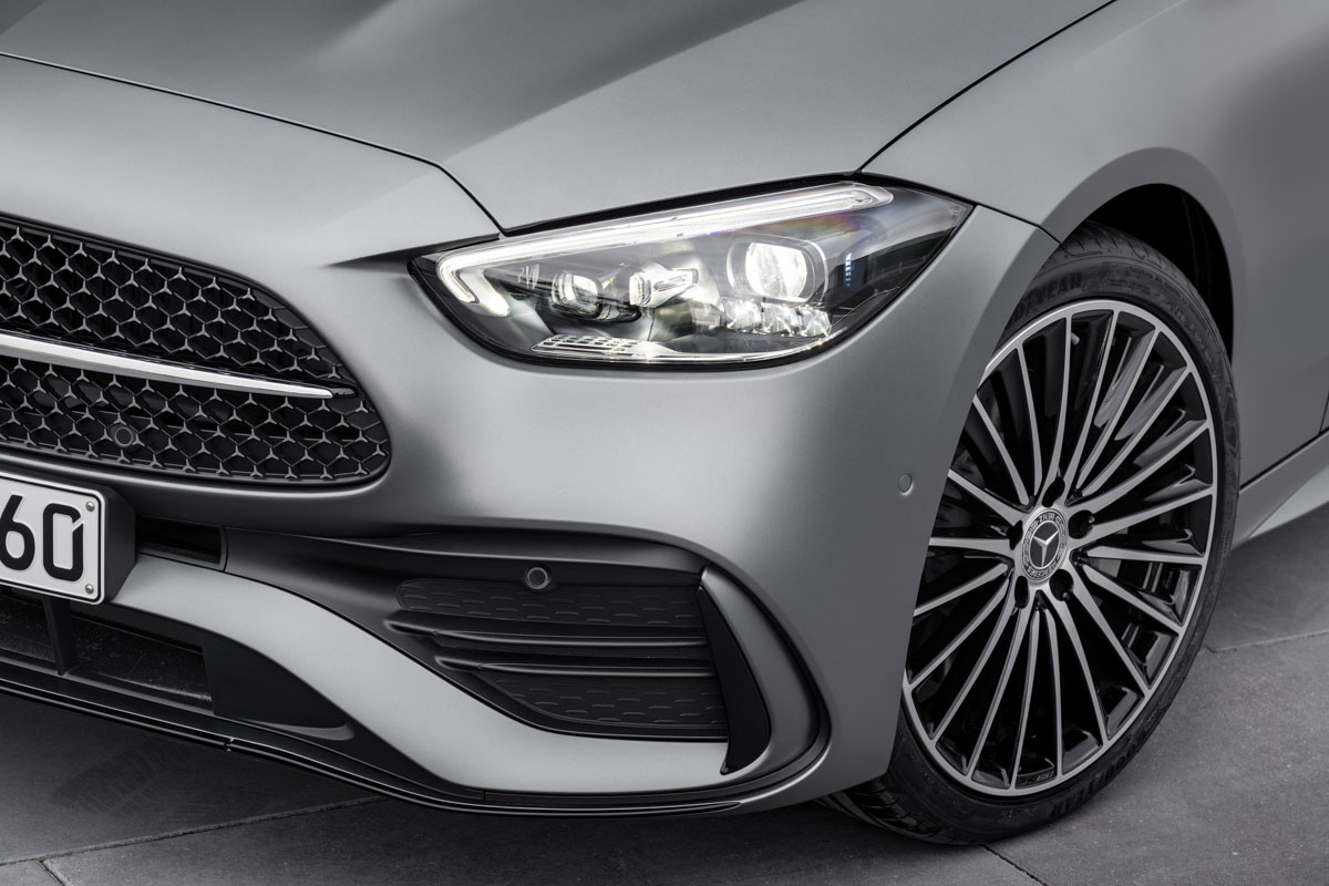 新一代 C-Class W206 基于第二代的 MRA 2 后驱平台打造,轴距方面相比上一代车型也增加了25 mm(2,865 mm),“驾驶舱后移”的车身设计进一步强化了运动气息。整体车身轮廓依旧是以流线型的风格为主,不过相比起 W205 在线条表现上则变得较为简约。值得一提的是,依旧维持“生气脸”风格的前脸造型这回首次采用了拥有“三角标”星徽元素的“星河格栅”水箱护罩设计,更加地 fancy 了。