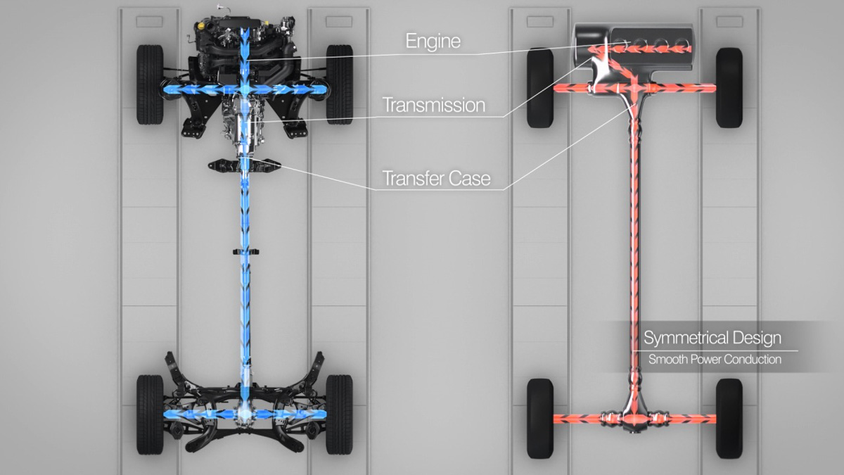 Subaru Symmetrical AWD (S-AWD) 中文译名“对称式全驱系统”,多了对称式这个称号也就意味着它与传统的 AWD 系统有所不同,它的传动轴位于中心位置,驱动呈直线左右对称排列在前后轴之间。不止是引擎采用水平对卧的平衡设定,就连四驱系统也要对齐,看来 Subaru 工程师的强迫症患得可不轻!