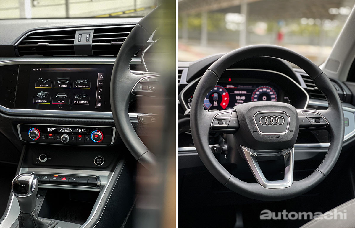 Q3 Sportback 的内装会让你真实的体验到什么叫德国的极致工艺以及豪华,进入Q3 Sportback的内装最先映入眼帘的就是两个超大的荧幕,数位化仪表以及车载主机,这个车载主机安内建的功能非常多,使用起来也相当流畅,另外仪表方面可以显示的车辆资讯也非常多,重点是在强光下也不会有看不清或者是严重的反光,这个细节做的非常好。