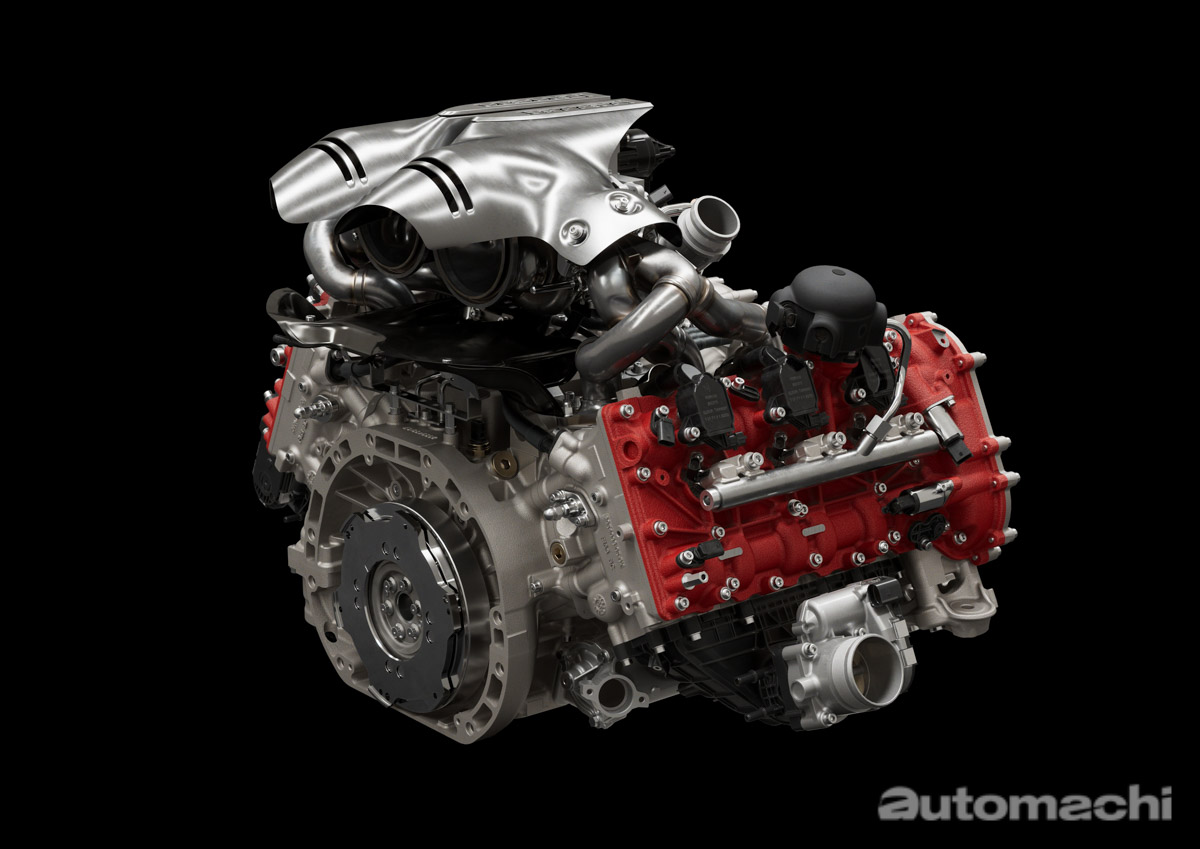 这具全新的 V6 引擎相比 F8 Tributo 的 V8 轻了30 kg,车身重心也比 F8 降低了10 mm,而引擎与马达之间设有离合装置,在 e-Drive 纯电驾驶模式之下可将两者分离,完全使用马达独立操作。Ferrari 也宣称,这具 V6 引擎拥有迷你 V12(Picocolo V12)的称号,能够发出足以媲美 V12 大哥的高亢引擎声浪。