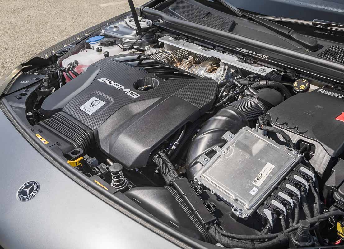 引擎方面, CLA 45S 继续采用了代号为 M139 的2.0L涡轮增压引擎,并且是高功率版本,最大马力表现为421 PS,峰值扭力500 Nm,匹配经过 AMG 部门调校的8速双离合器变速箱,并且有 AMG 运动悬吊以及具备漂移模式的加强版 4 Matic+ 全轮传动系统,根据官方数据这款车的0-100加速表现仅需要4秒,极速可以达到270 KPH 。