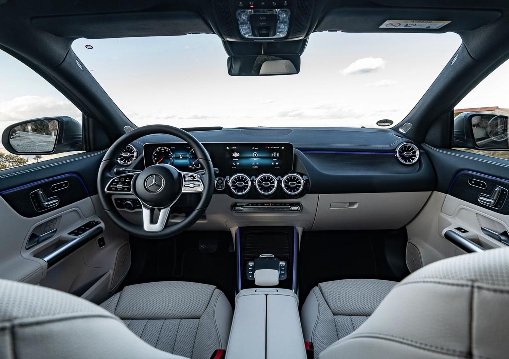 内装方面也是 GLA 可以被称作脱胎换骨的原因,新一代的 GLA 延续了 A-Class 上面非常前卫的和科技感的内装设计,这个内装设计绝对可以让大部分人都为之惊艳,因为其气氛灯的设计真的是非常亮眼,另外双荧幕的设计显示效果也很好,只是在一些情况下荧幕的反光非常严重,可能会造成视觉阻碍,在旧一代车型上我们没有办法投诉太多,这款车的设计有一定的年纪了。
