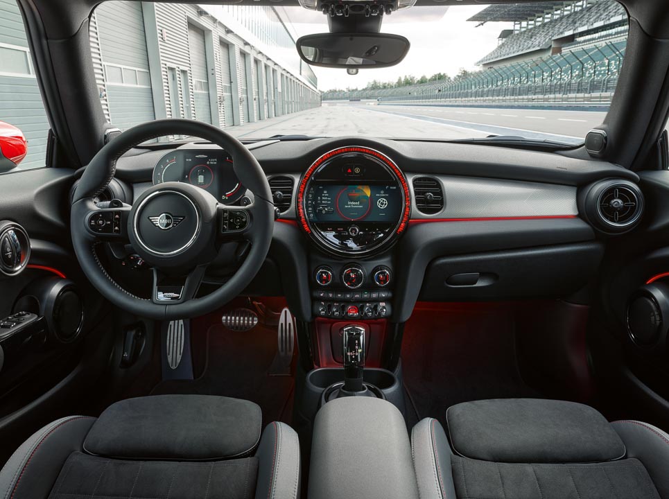 内装部份新的 MINI JCW 同样维持了之前升级版车型的内装设计风格,全新的气氛灯设计非常抓人眼球,加上红色的光条设计以及碳纤维的饰板,完全是和外观有着相呼应的设计,座椅上面也有防滑的麂皮材质保障在激烈驾驶时候驾驶者不会左右摇晃,另外不少细节上面也可以看到 JCW 的铭牌!