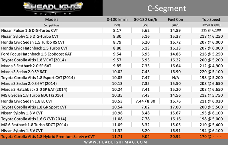 至于在油耗方面,自然是这款车的强项,我们都知道官方公布的油耗和实际我们使用的油耗会有一定的差距,因为官方测试的道路和我们实际驾驶的道路会有所差异,驾驶方式也因人而不同,所以一切的油耗数据都只是参考而已,而根据 Headlightmag 的测试,在开冷气,车上乘员2人的情况下 Corolla Hybrid 在时速110公里的情况下油耗表现为20.92公里!这个油耗在同级车款中属于最顶端的那个了!