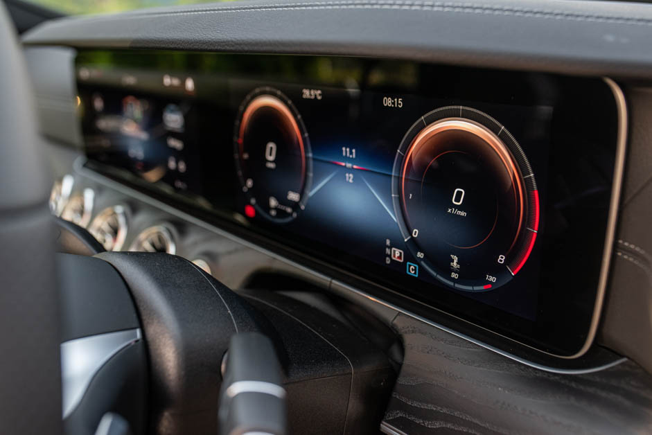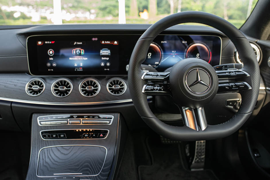 打开 Coupe 跑车的无框车门,映入眼帘的是一个质感很好,科技感提升许多的内装,比起旧款 E-Class Coupe,2021 新款车型升级了 AMG-Line 新设计双层式多功能方向盘,12.3寸全液晶仪表以及12.3寸 MBUX 触屏主机,而中控台设计则维持不变,与旧款车型一样,毕竟这只是小改款车型。