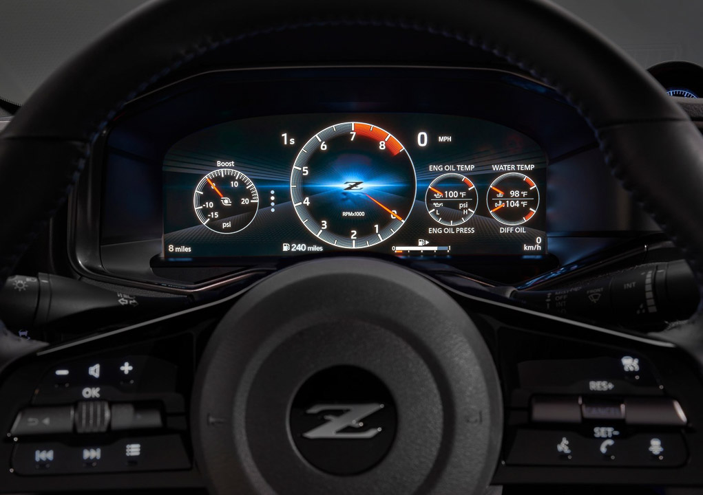 引擎方面没有意外的采用了3.0L的 V6 双涡轮增压引擎,最大马力400 Hp,峰值扭力475 Nm,匹配的是6速的手排变速箱或者是9速的自排变速箱,并具备了limited-slip differential 限滑差速器,另外不管是手排版本还是自排版本均提供选配弹射起步模式,而 Z 的 Performance 版本也具备了受 GTR35 启发的铝制换挡拨片。