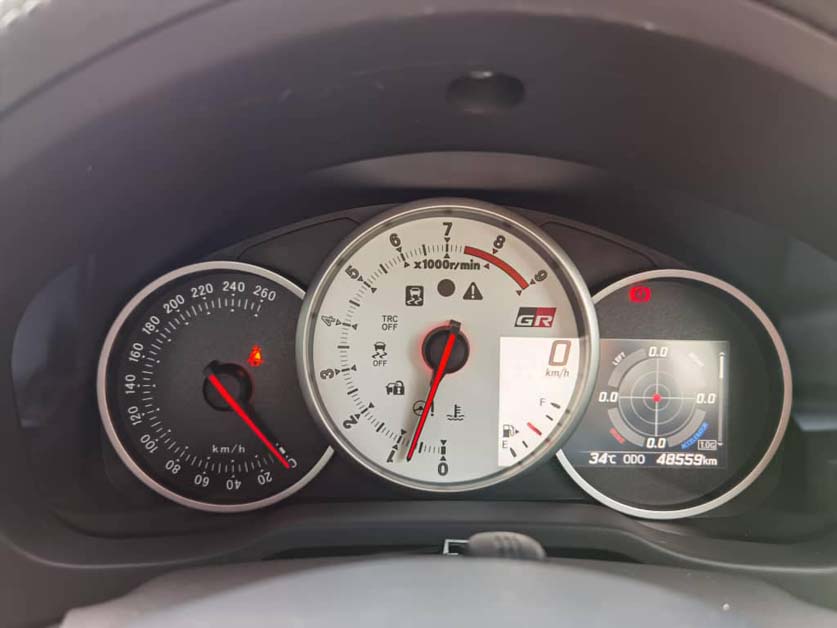 除此之外,在还拥有带有红色卡钳的 Brembo 制动系统,专属的 GR 名牌,运动化的方向盘,麂皮材质的赛车座椅等等,这些都是普通版本车型上看不到的,而内建的触屏主机还支援了赛道圈速计时,横向加速度监测(G Force 侦测仪)/转速/车速电子三联表等赛道化功能,一看就知道这款车的是为赛道而生。