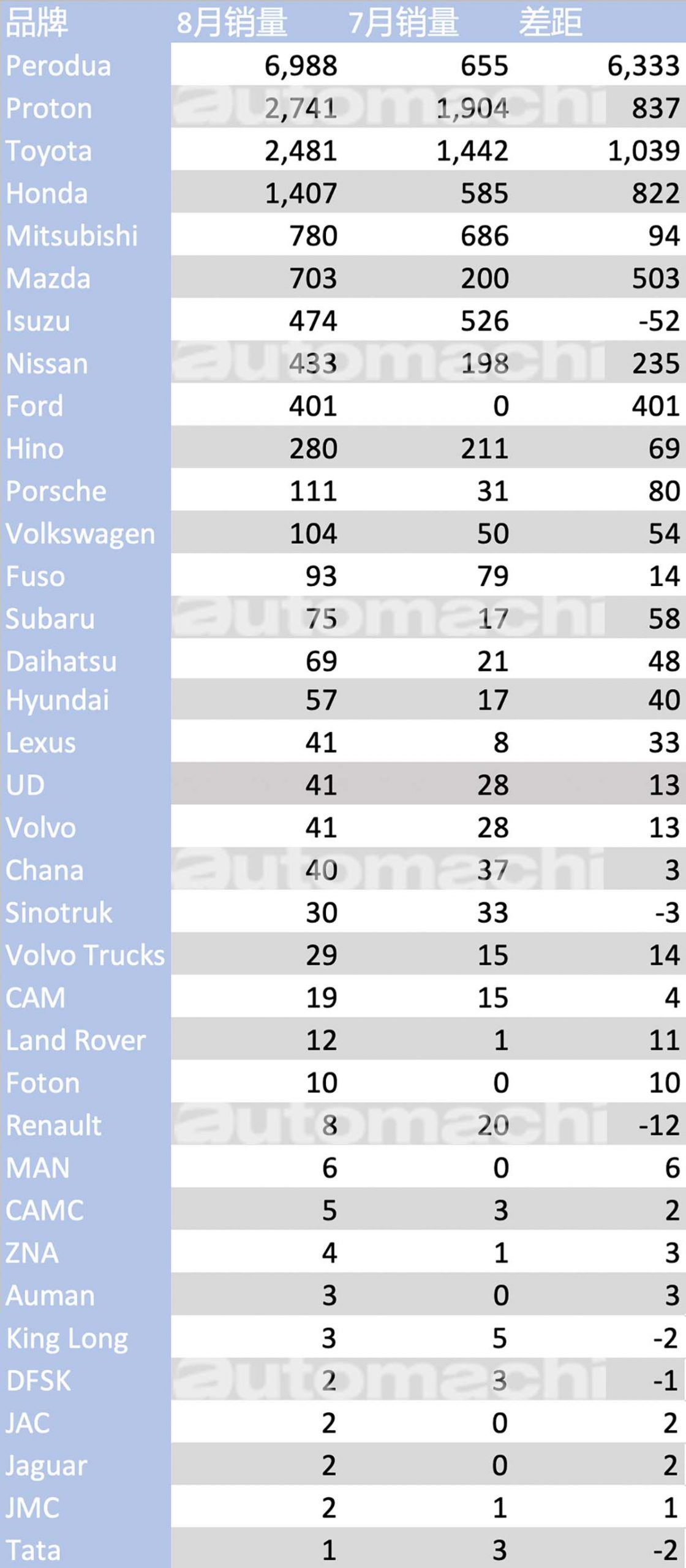 至于第二名,则是为 Proton ,虽然 Proton 在8月分发表了小改款的 Iriz 以及 Persona ,但是销量提升幅度并不大。在7月该品牌卖出了1,904辆,但是在8月仅有2,741辆,会出现以上的情况,很有可能是 Iriz 以及 Persona 销量不如预期,又或者是 X70 以及 X50 的产能不足,不过相信 Proton 在今年可以稳占销量榜第二名的宝座。