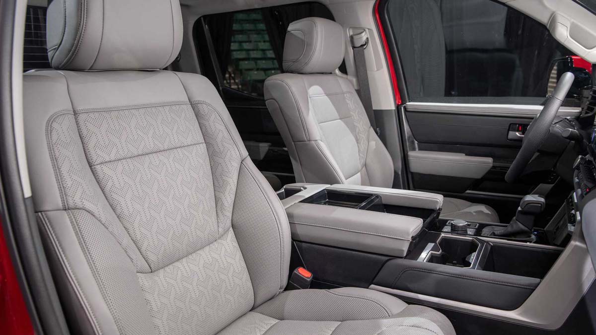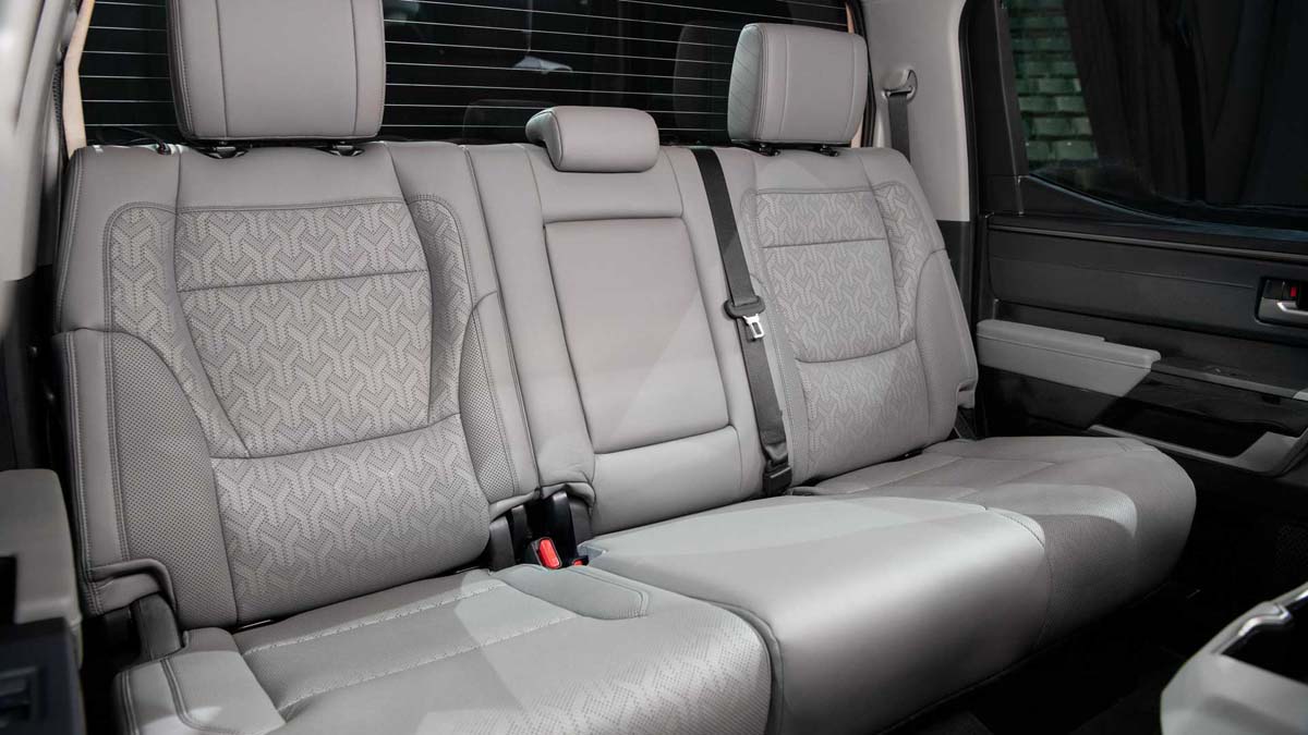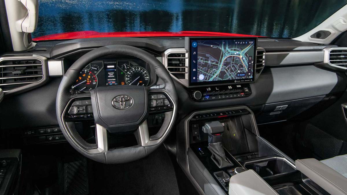 内部设计方面新一代的 Tundra 也是显得非常“孔武有力”,包括了非常大的方向盘,冷气出风口以及大尺寸触屏主机等等,一些都和“大”有关,这样的设计风格在以往的 Toyota 车款上面都是非常少见的。除此之外,这款车也具备了大量的储物空间,乘客的物品例如手机和包包等等都有足够的地方可以放置,不过相比起上一代车型,后排乘客的空间会有一定程度的缩小,这是因为新一代 Tundra 提供了可选配的天窗,所以会一定程度压缩了头部的空间。