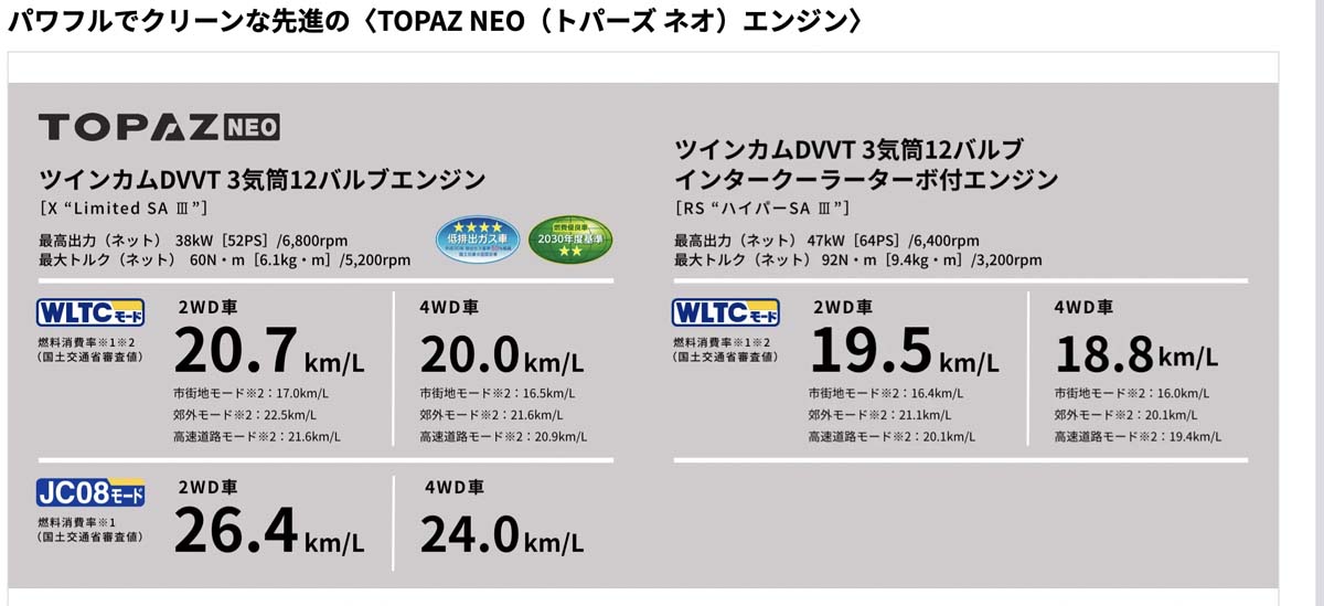 引擎部分,因为 K-Car 法规的关系因此这款车只能够采用660 cc的引擎,但是和其他的同级车款一样有自然进气以及涡轮增压可以选择,引输出分别为52 PS/60 Nm以及64 PS/92 Nm,变速箱为 CVT ,而且因为日本拥有下雪天气的关系所以你可以选择前轮驱动车款或者是四轮驱动车款!