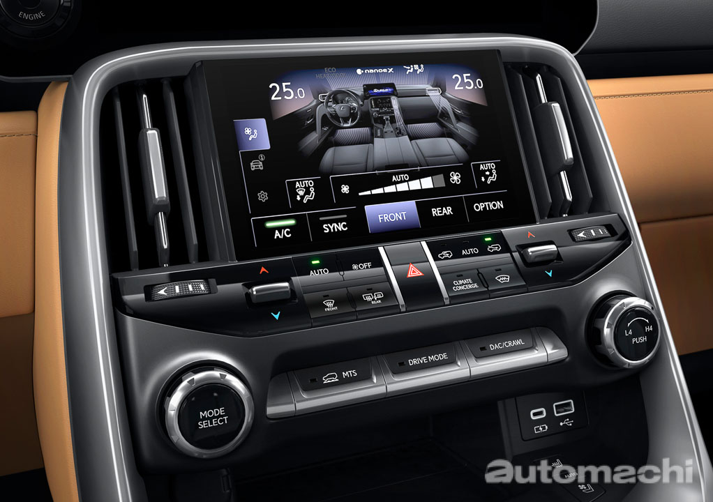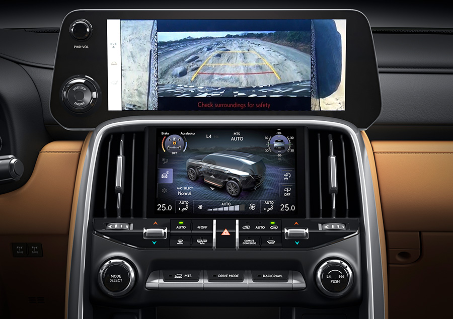 LX 的其中一个特性就是具备了卓越的越野能力,而为了在极端的路况提供更安全、更舒适的驾驶体验,其中控台上采用了 Lexus 品牌首款双屏联动系统(上方荧幕尺寸为12.3英寸,下放荧幕尺寸为7英寸),在这个荧幕上可以显示多种资讯,其中包括了 Lexus 全球独创的车底仰视系统,它可以显示车身底部以及后部的影像,给你更好的驾驶视野以避免碰撞。