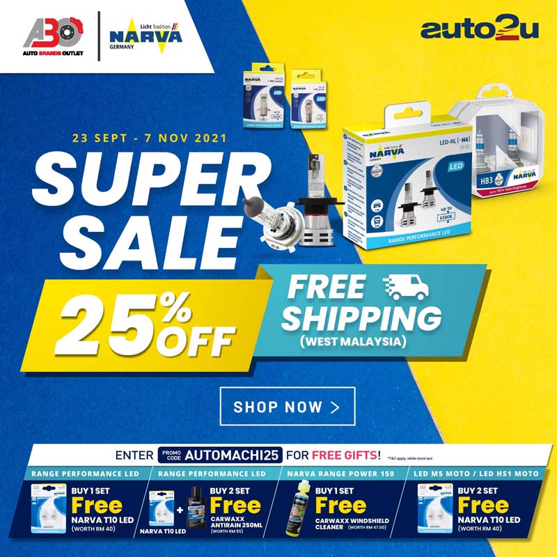 目前在 Auto2U.my 提供了绝佳优惠,只需要登陆https://bit.ly/a6-auto2u-narva-promo 即可选择你想要的产品,并且在使用优惠码:AUTOMACHI25 就可以享有25%的价格优惠,而且在满足特定条件下(例如说购买两套)还可以获得赠品!重点是西马地区包邮,而东马地区因为你的物品需要乘坐飞机的关系,因此需要缴付RM 8的邮费!以上的优惠从即日起到11月7日,各位千万不要错失良机咯!
