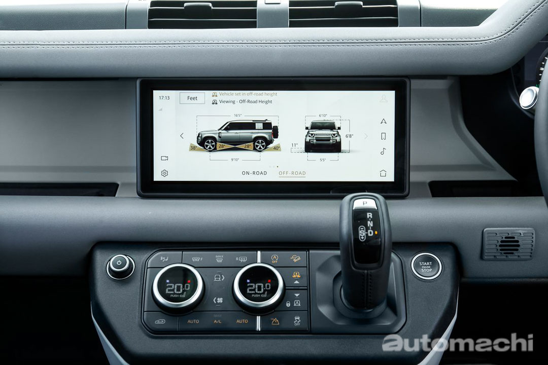在一般的版本上 Defender 采用了2.0L公升 Ingenium涡轮引擎,可以在5,500转能产生300 PS的最大马力,在1,500至4,500转产生400 Nm的峰值扭力,如果你对于引擎的动力有着更好的动力需求你还可以选择效能更高的3.0L涡轮增压引擎+48V MHEV系统,这个动力选项可以产生最大 400 PS的马力以及550 Nm的峰值扭力,时速0-100的加速为6.1秒。