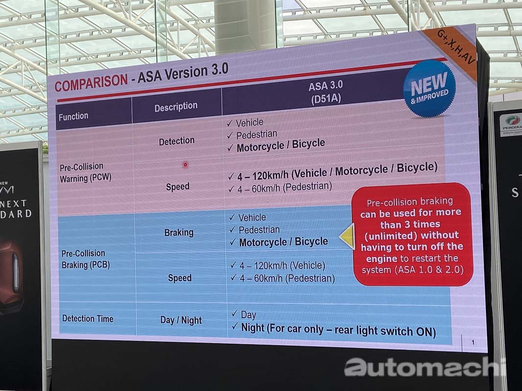 这一次的 Myvi 在安全配备上面也是有着极大的升级,从原本的ASA 2.0进化之ASA 3.0,并且除了最入门的1.3G Basic 版本之外其余的版本均标配了这一项功能。前方撞击预警和自动紧急刹车的的可运行速度从原本的时速0-80提高至4-120(汽车、摩托车以及脚踏车)还有4-60(行人),运用的场景更广泛!另外以前的 ASA 只有在白天才能运作,这一次新版本则是在夜晚也可以检测到道路情况(只限汽车,并且是在开启尾灯的情况下)。