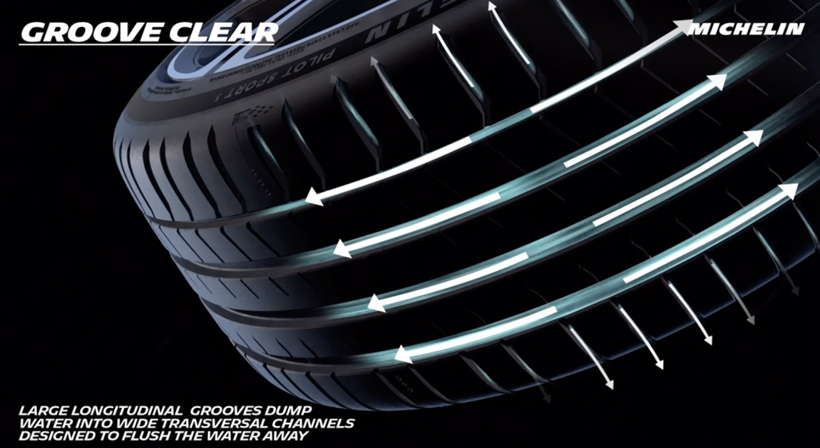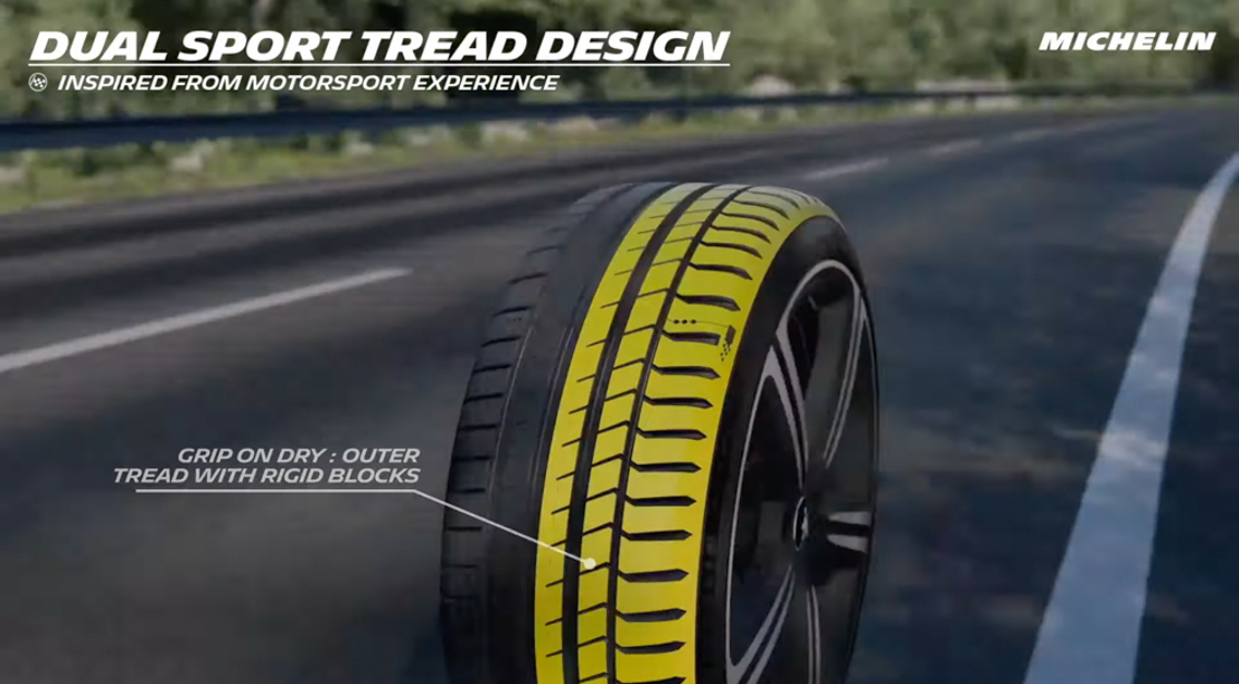 第三个则是 Dual Sport Tread Design,Pilot Sport 5 的内侧和外侧有着不一样的纹路设计内侧为了应付湿地的时候的排水有更大的排水槽,而外侧为了在干地的时候有最好的抓地力表现采用了纹路更硬的设计,并且新轮胎的排水槽设计导入了 Groove Clear 技术,能够有效提升轮胎的排水性能,以确保驾驶者在雨天的道路行驶安全。