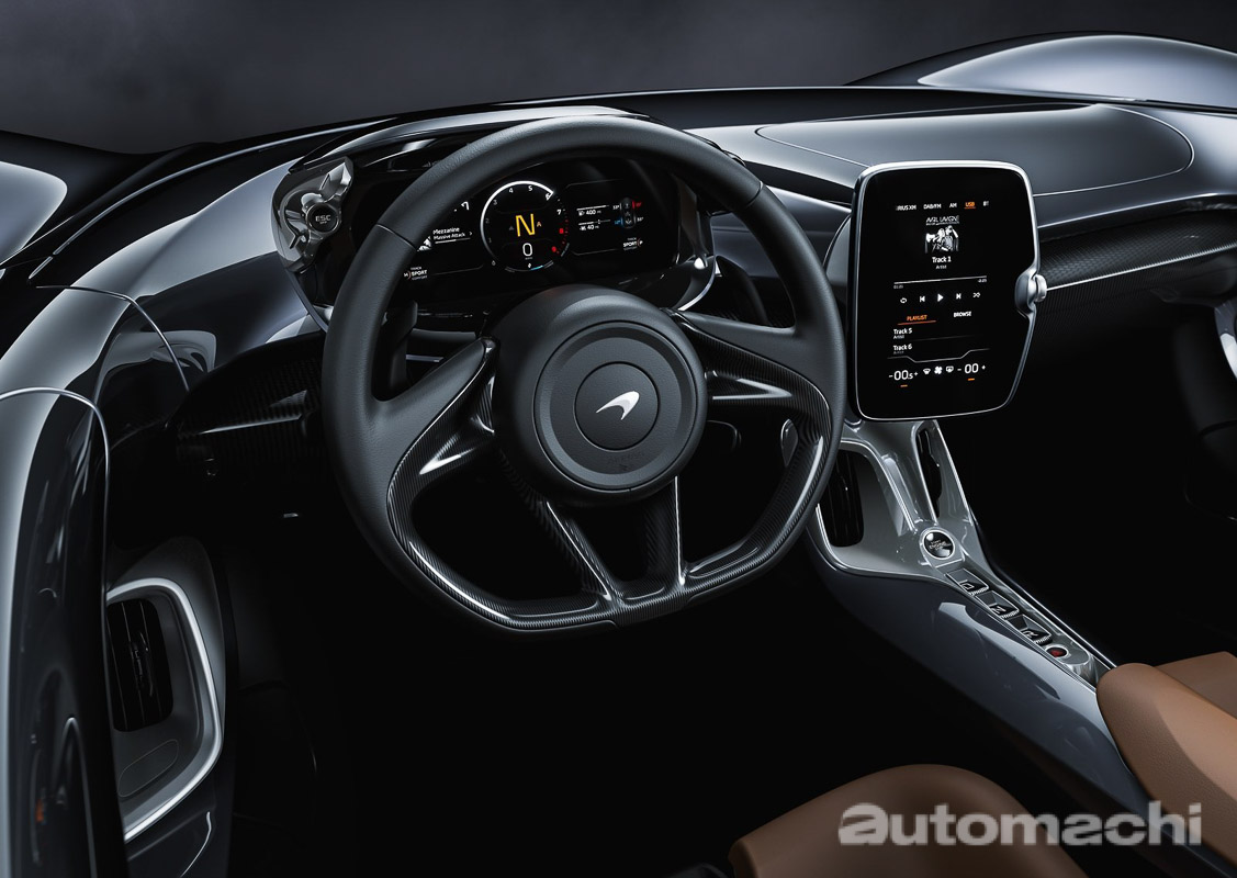看完外观看内饰,比起外观激进的造型,内饰则还是 McLaren 一脉相承的家族式设计,赛车方向盘,多功能液晶仪表,大尺寸的多媒体主机和真皮赛车座椅等等配置都有,加上碳钎维配件和钢琴烤漆点缀,让整个内饰看起来非常运动化的同时又不失格调。