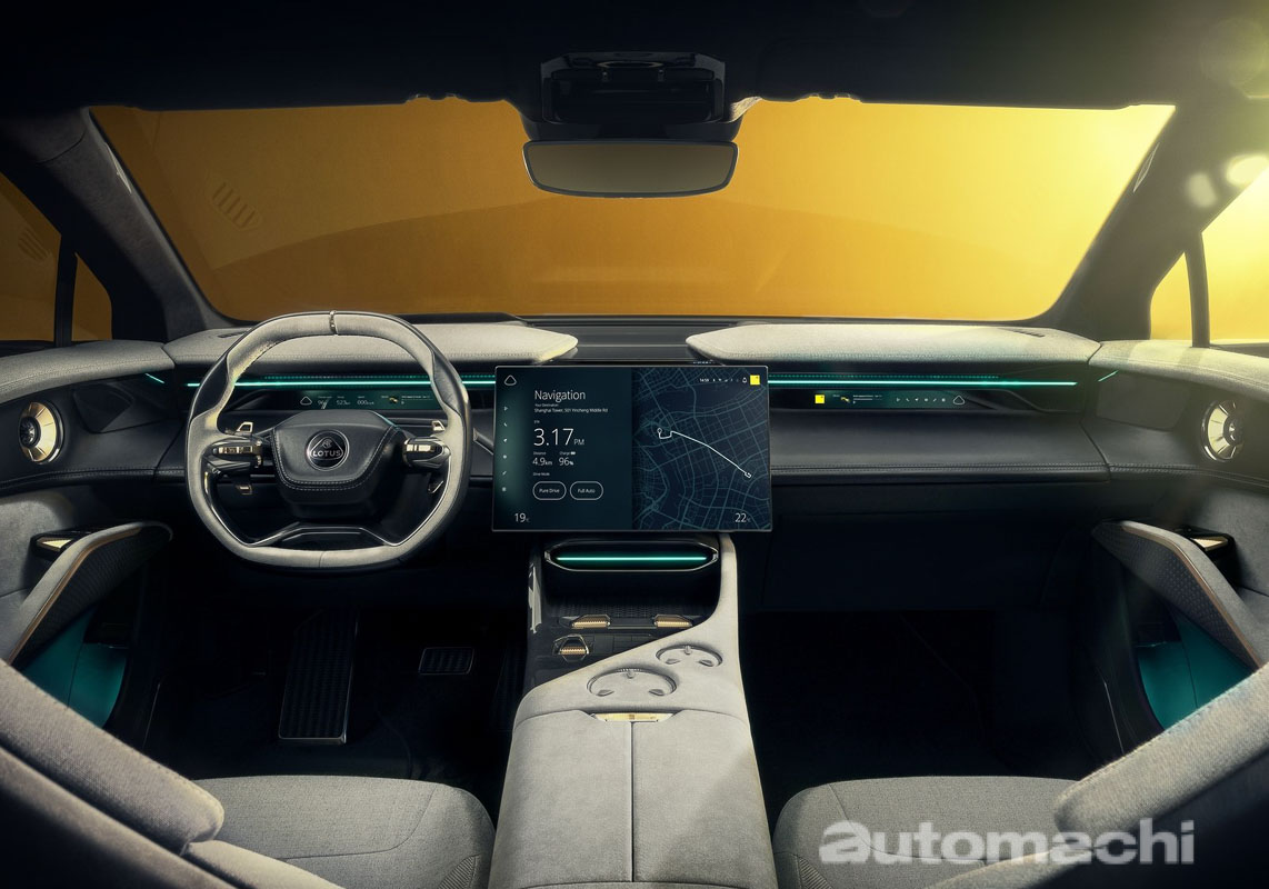 内饰方面,Eletre 的内饰非常有未来感,仪表板巧妙隐藏于驾驶者前的中控面板内,同时在中控上加上 15.1 寸的 OLED 大屏为整个内饰的科技表现加分不少。另外在方向盘上是上下平底的方向盘设计,同时加上小巧的触控式按键,很好地带来了赛车的既视感。
