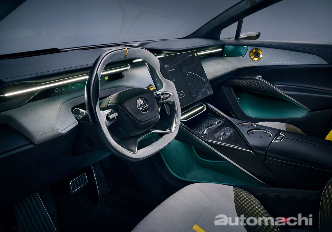内部设计风格非常的不 Lotus ,因为你可以看到非常巨大的中控台荧幕,尺寸达到了15.1寸,而且采用的 OLED 的材质,这样一来不仅可以提供高对比度以及高亮度,也可以让你在大太阳底下看的很清楚!后座方面,这辆车提供了 4 座和 5 座两种座椅布局,在 4 座车型,后排是 2 张赛车运动座椅,同时有着一个巨大的中央扶手,上方还有一块 9 寸大屏,能够让后座乘客查看行车资讯,并且够控制车辆的一些功能如冷气,音乐等等。