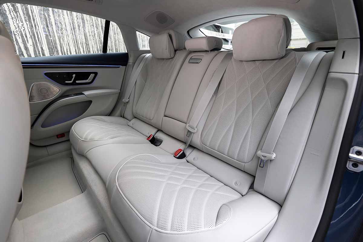 来到内饰,原厂最新的 Hyper Screen 三联屏设计绝对给到你震撼的感觉,12.3 寸的全液晶仪表,加上 17.7 寸中控触屏主机和 12.3 寸的副驾娱乐主机,形成了 1.41m 宽的 OLED 屏幕,加上了奔驰擅长的氛围灯衬托下,整个内装科技感十足,另外作为奔驰的旗舰电动车,这款车也有着很丰富的配备,除了前排三联屏外,也在后排配备了最新的 MBUX 娱乐主机,配上 Burmester 3D 音响,给到车内乘客很好的娱乐体验。