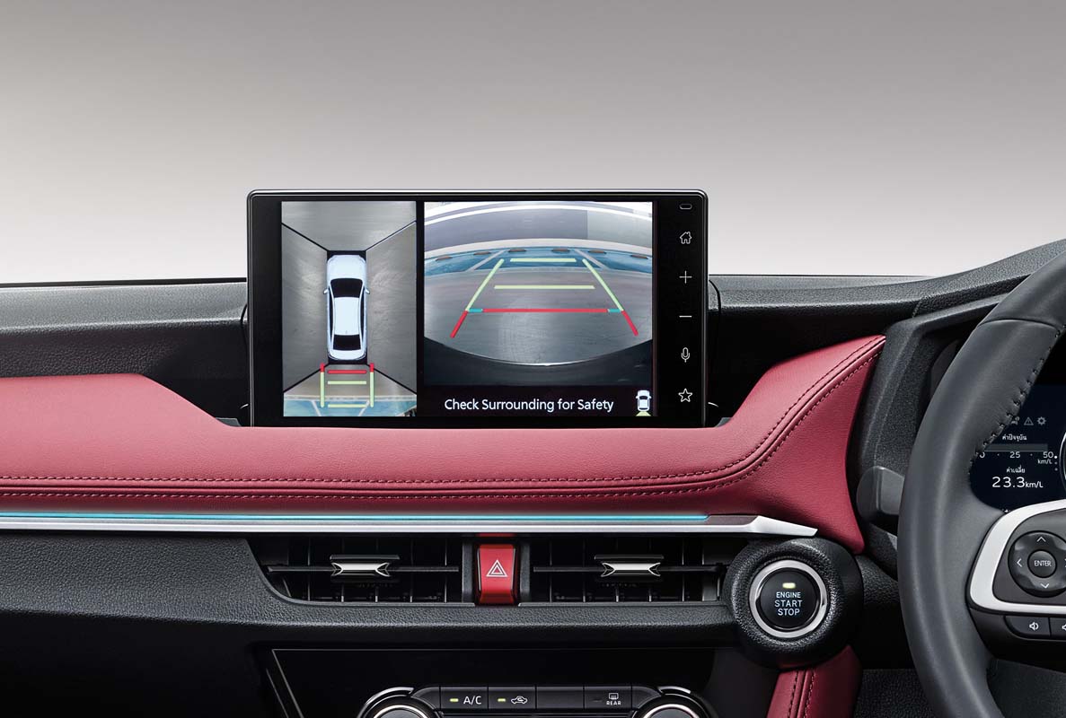 安全配备部分,新车配备了360度镜头、前方撞击预警、自动紧急刹车、车侧盲点侦测、倒车盲点侦测以及全速域的主动式定速巡航,相信这个全速域的主动式定速巡航是和 Alza 一样的。