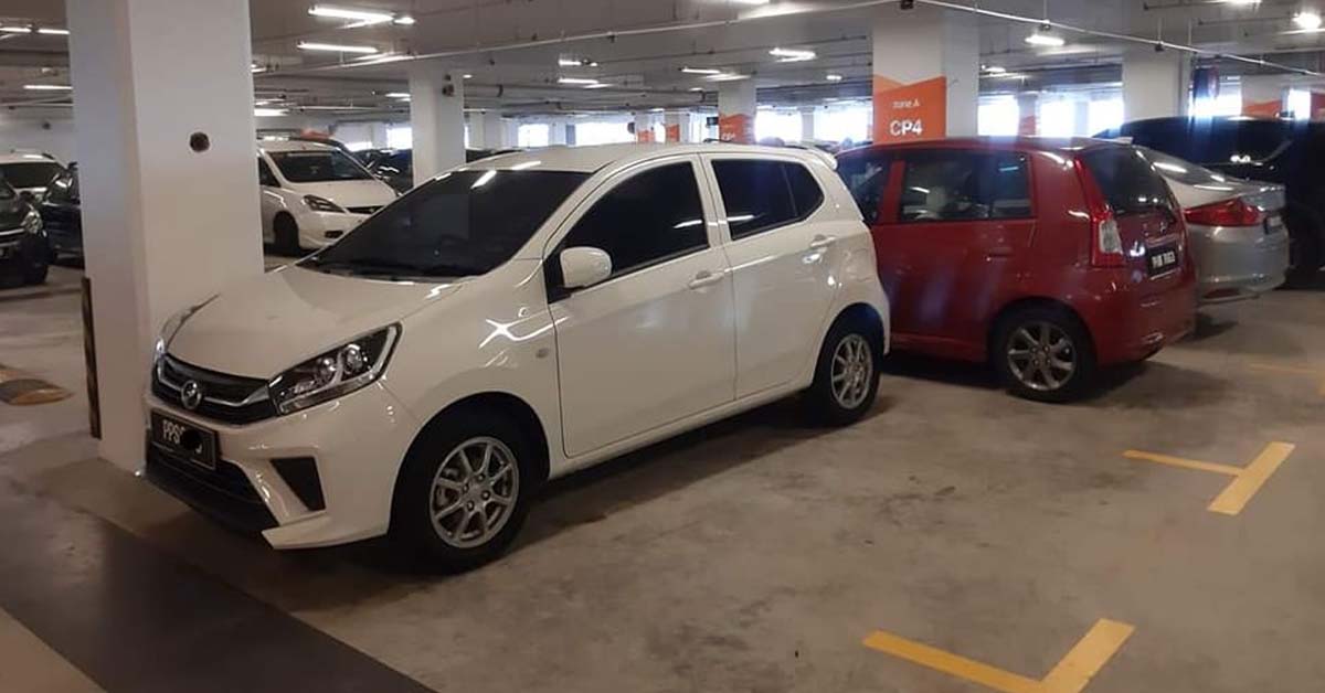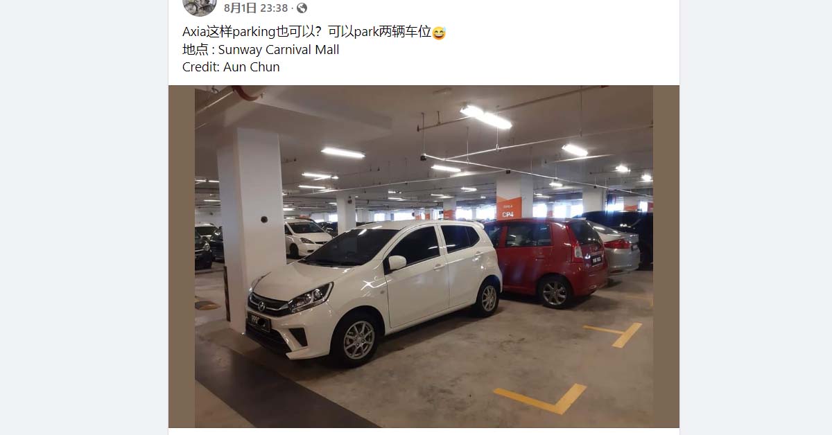 Perodua Axia 车主在 Shopping Mall 内将车子打横 Park 在停车格外,被放上网后却因为这一举动帮助留有空位给多一辆车停泊而被网友赞赏!