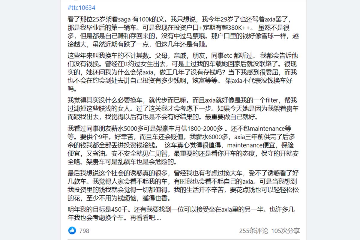 近日一名 29 岁的男网友在社交媒体上匿名发帖,表示他目前的薪水有着 RM 6,000,而随着工作多年的存款和投资,他目前的存款有 RM 380,000++,可是当身边的人包括父母、亲戚、朋友和同事等等建议他换一辆好一点的车时,他都以没有钱来回绝了他们,并坚持驾着他的 Axia。