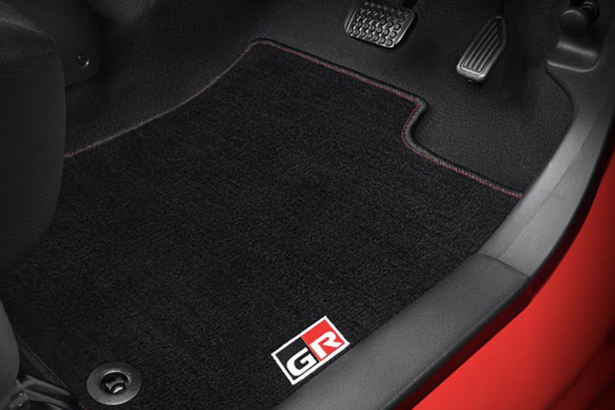 来到内饰,这款车依然是大量强调 GR 赛车魂的元素,只要你看得到的地方都大量置入了 GR 的徽章,像是方向盘,Push Start Button,专属地毯等等,而且仪表盘有红色的点缀,更突出了运动化的氛围。