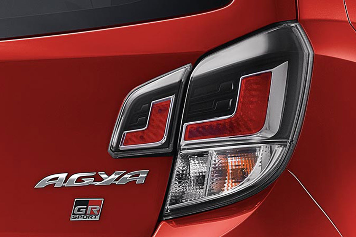 车尾的部分,这款车有着设计非常独特的尾灯组,左右两边像是各藏了两个 L 字形的小灯,不过最吸引眼球的还是上方那个黑色的尾翼,同时在保险杠部分还带了扰流器,进一步加强整车的运动氛围,另外 AGYA 车型名字下面还是一个 GR 徽章,似乎在告诉后车我不是好惹的。