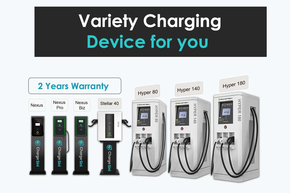 那目前他们和 Sangitech 合作,目前有七种不同的充电设备,分别是三种 AC 快充的充电桩和四种不同的 DC 快充充电桩,输出功率为 AC 快充 7 kW – 22 kW,DC 快充 40 kW – 140 kW 之间,基本上覆盖了主力电动车所需的充电功率。