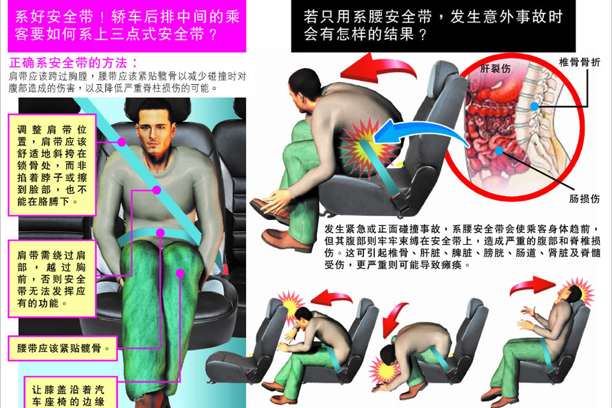 另外你不要以为坐在后座没有冲出车外的可能性你就安全了,因为撞击后你将会撞到前座椅子的后面,这不止会导致你自己受伤,更可能为同时前座乘客带来伤害,使得前座乘客因车祸死亡的机率提高 5 倍以上。