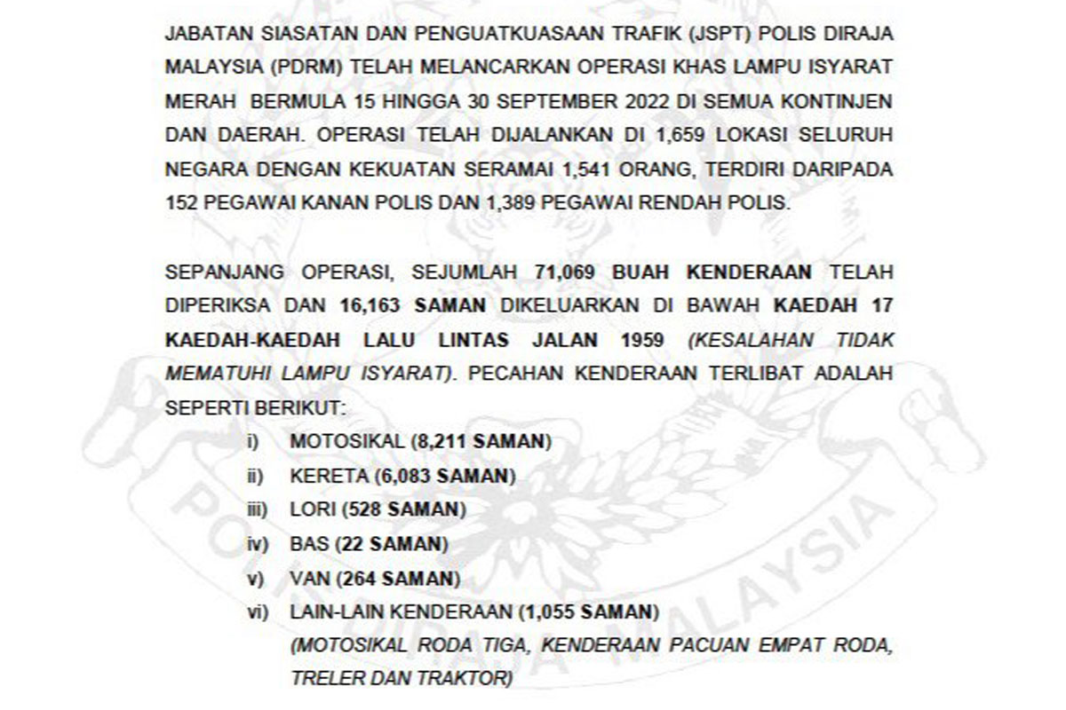 这一次的行动是由警队交通调查及执法局主导,共动员了 1,541 名警力,在全国 1,659 个地区展开行动,而在执法期间,警方共检查了 71,069 辆车辆,并开出了 16,163 张罚单,在所有闯红灯的罚单中,由摩托骑士犯下的最多,共开出 8,211 张针对摩托闯红灯的罚单,其次是轿车 6,083 张,罗里有 528 张,货卡有 264 张,巴士也有 22 张,至于另外的 1,055 张则是由其他交通工具驾驶者被罚,从数量如此之高的闯红灯的罚单来看,可以侧面想一下为何我国驾驶者这么喜欢闯红灯。