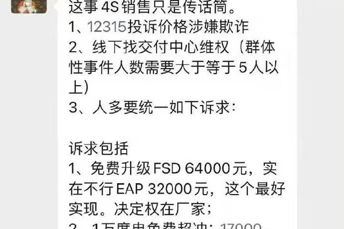 另外,对于这一次原厂直接无预警宣布降价,不能接受的车主们就自发建立了维权群,希望能通过集合大家的力量一起给原厂施加压力,而他们也希望原厂会给予他们补偿,并列出 4 项诉求包括了免费升级价值 64,000 元人民币(RM 41,479)的 FSD 自动驾驶、价值 25,000 元人民币(RM 16,202)的 10,000 kWh 的免费超充、赠送充电桩以及把特斯拉的拿出来股份平均分配。