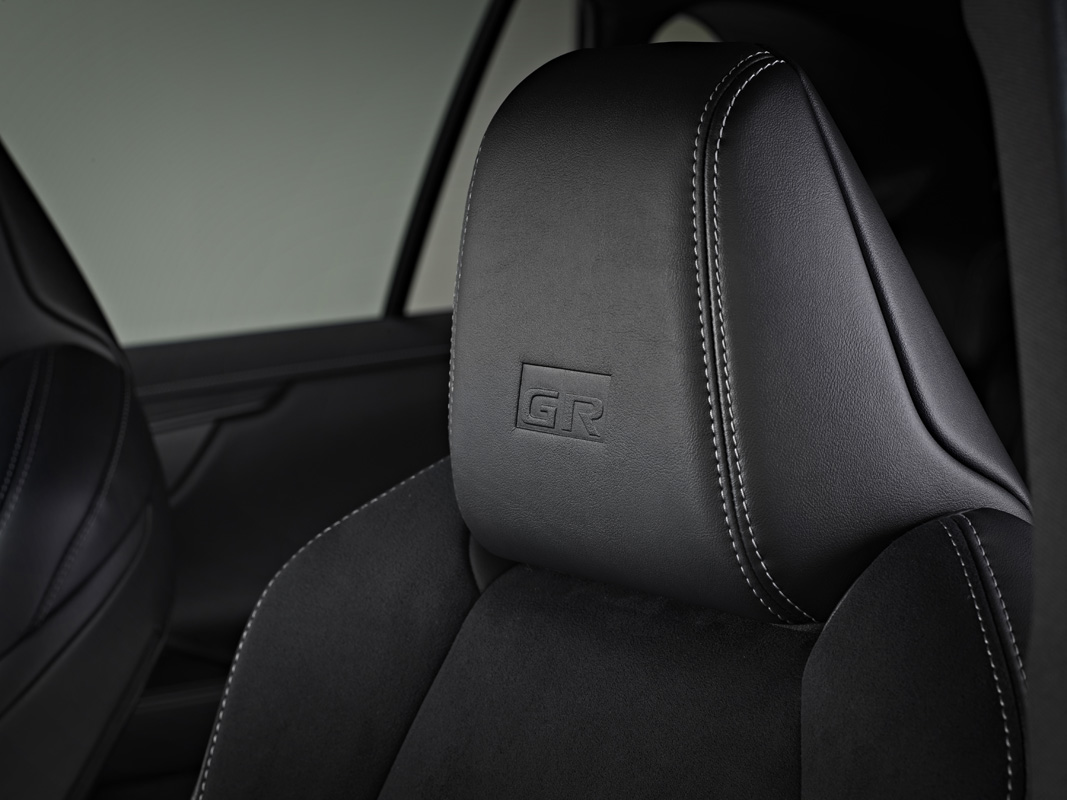 内饰方面,这款车和普通车型基本上没有什么不同,10.5 寸全液晶仪表和 12.3 寸悬浮式中控触屏主机依然能在它身上看到,但是在细节部分就能看到更运动化的点缀,首先在头枕上和方向盘上有 GR 的徽章,同时还有高对比度的银色缝线。