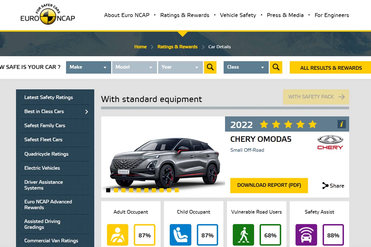 Chery Omoda 5 获 EURO NCAP 5 星评级!中国车出色安全性再获国际认证!