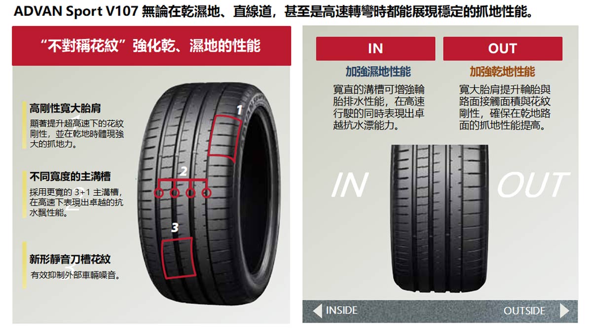 另外除了配方外,新轮胎也有着三大构造,包括了高刚性且宽大的胎肩、不同宽度的主沟槽和全新的静音刀槽花纹,另外这个轮胎的内侧和外侧有着不同的纹路,外侧宽直的沟槽可以带来出色的排水性能,让轮胎在高速行驶时不容易遇到水漂的现象,至于内侧宽大的胎肩和花纹的刚性可以让轮胎在干地有着出色的抓地力。