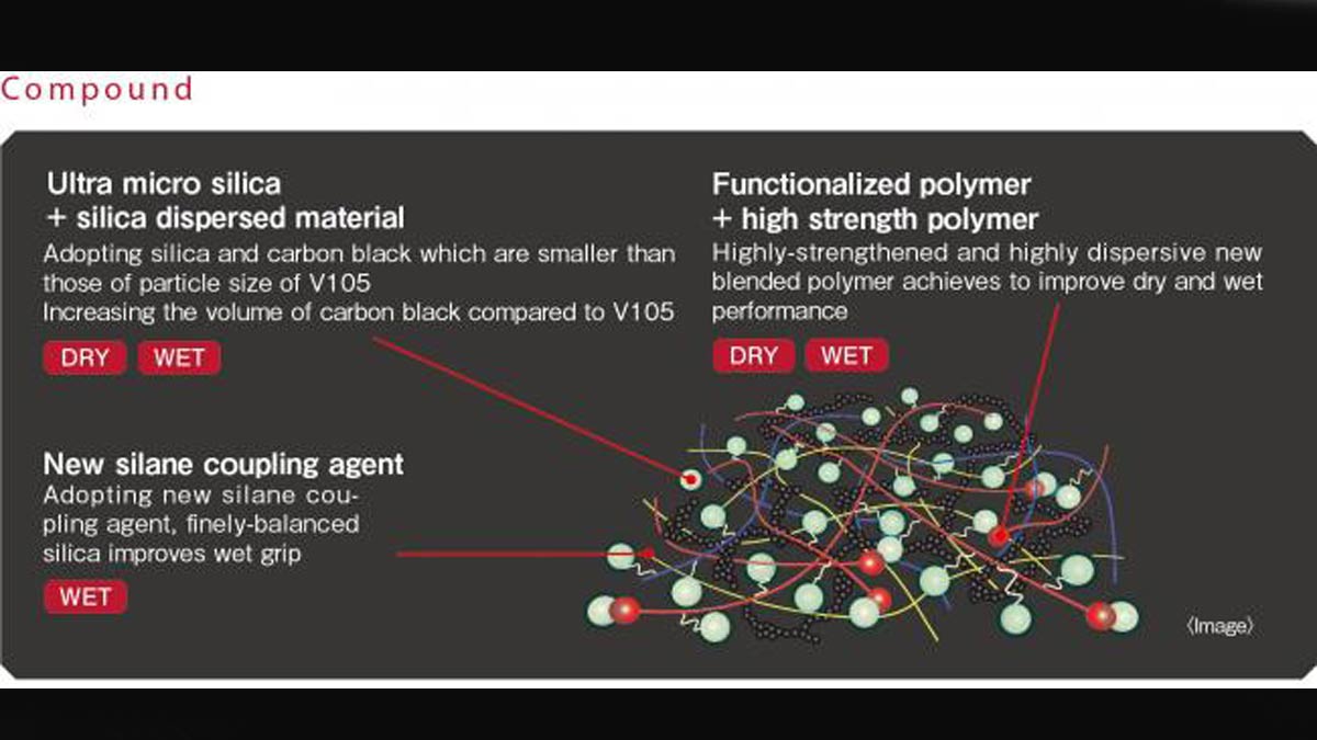 这一次的新轮胎主要通过他们专用的橡胶合成物配方,将矽灰、二氧化矽分散剂、功能基化聚合物、高強度聚合物以及新型矽烷偶联剂等混合在一起打造,这些技术能够帮助这款轮胎在干湿地,直线,还有高速过弯时都拥有出色的抓地力表现。
