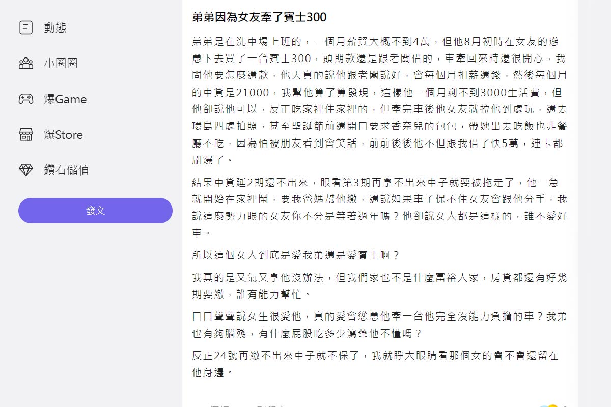 让网友不禁好奇,到底这个女的是爱他的弟弟还是爱车呢?而在网友的贴文中有说到,在 24 号就是最后的期限了,到时候在无法偿还贷款车子就会被银行拖走,网友已经决定并不会帮他还贷,并拭目以待之后他的女朋友会不会留在他身边。