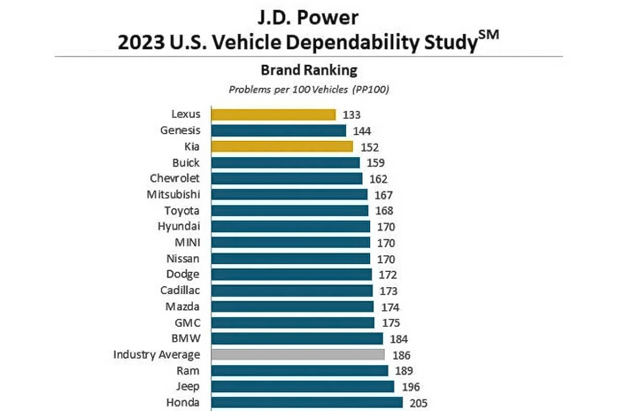 J.D. Power 近日公布了他们针对美国市场消费者做的汽车可靠性研究,其中数据表明在过去一年内,Kia 以远低于行业标准的故障率,成功夺得了 2023 年最耐用的大众市场汽车品牌头衔,并且在多款车型上榜成为同级最耐用车款,可以看出韩系车这几年在可靠性上有着明显提升!