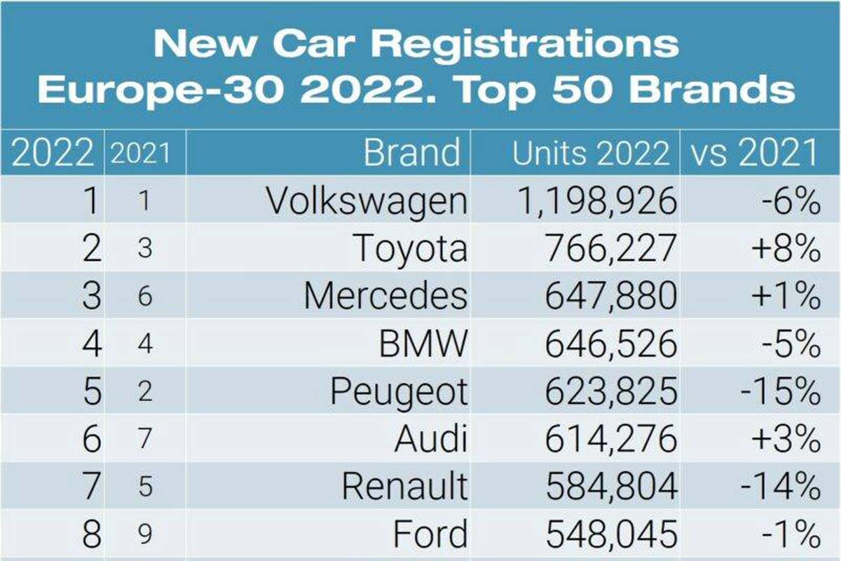 Volkswagen 还是欧洲市场霸主!2022 年销量大幅领先 Toyota 成为欧洲最畅销车企。