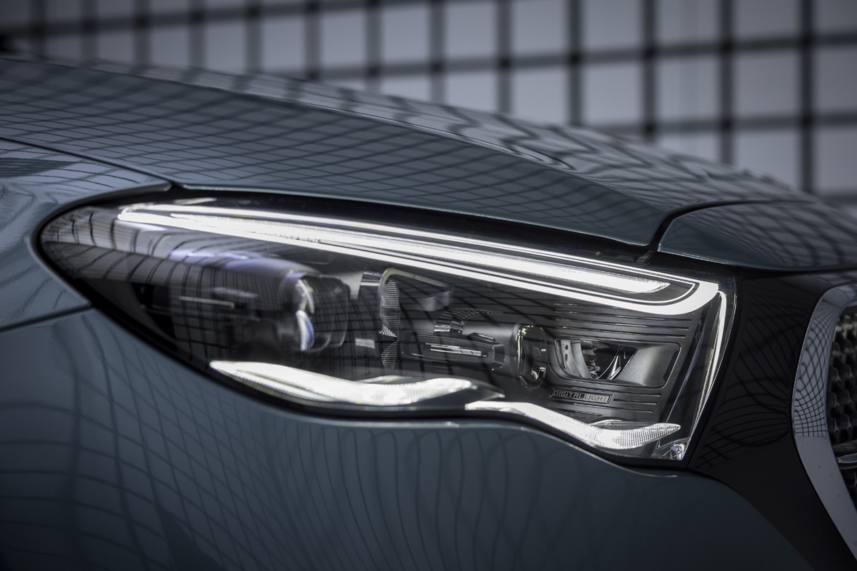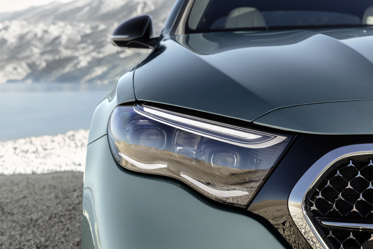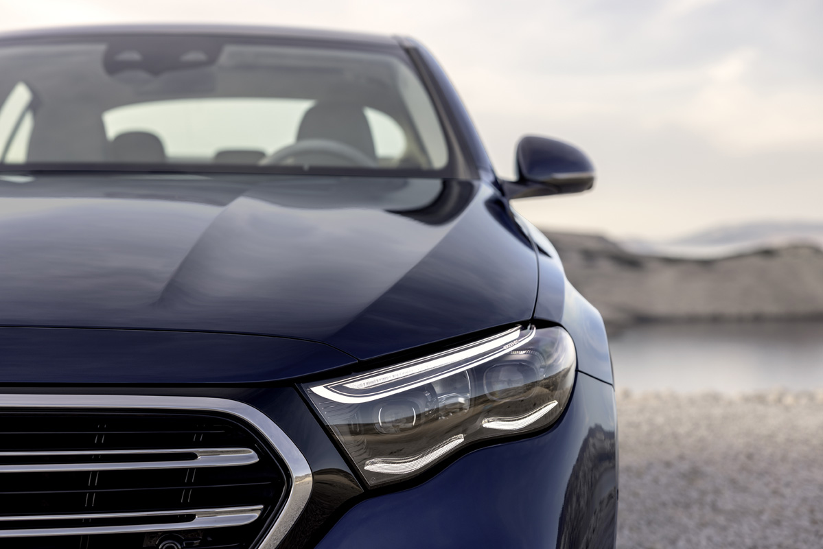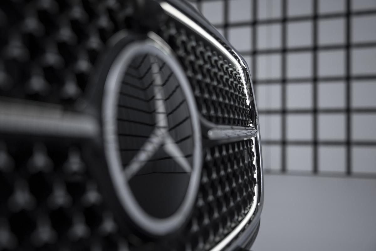 在外观上可以看到这款车主打的是比较运动的设计风格,整个车采用的是扁平+流畅的线条设计,在前脸它有着立标和大 Logo 两种不同的设计,它们都是有一圈镀铬饰条的水箱护罩,不同的只是立标里面是横条式设计,而大标则是维持了大的三芒星 Logo 配上小小个的三角星座点缀,加上不一样的保险杠设计,另外它的头灯组也致敬了经典的“花生灯” E-Class,让它看起来既前卫,但是又带点复古风。