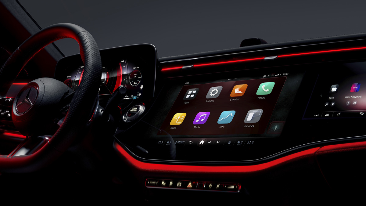 至于在内饰,它采用的是和 EQS 一样最新的 MBUX Hyperscreen 三联屏设计,屏幕的上方是贯穿式的冷气出风口设计,加上前座从门板到中控台都有上下两层的氛围灯,让整个内装变得非常地科幻,就好像置身在太空飞船内一样,而且它的主机功能也很强大,可以让你使用 TikTok,玩游戏,通过车内的自拍镜头使用 Zoom 和 Webex 等应用参与视频会议或是拍照,而且只要你提前设定好,车子可以根据环境温度自动调整车内的设置,比如太冷自动打开座椅加热,将氛围灯调至较为温暖的颜色等等,相当智能和有仪式感。