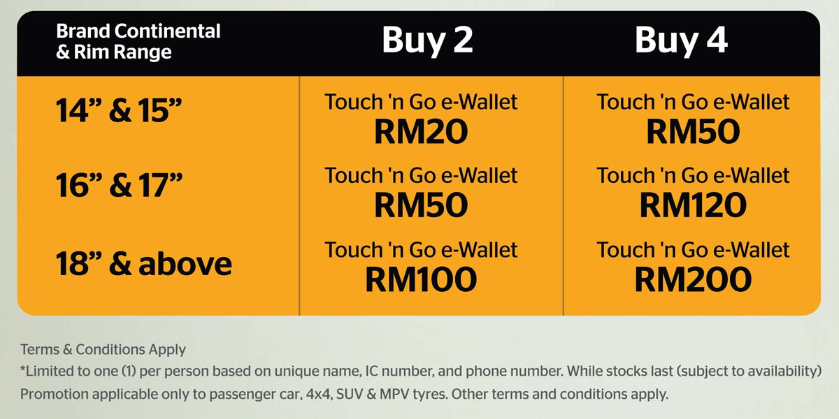 开斋节优惠!6 月 30 日前购买新轮胎,Continental 将提供 1 年一换一保固,并送出高达 RM 200 的电子钱包礼券。
