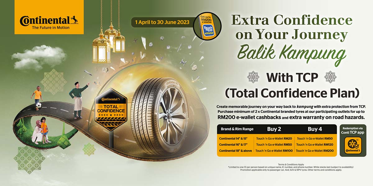 为了配合开斋节和欢庆 Continental Tyre Malaysia 成立 60 周年,他们将为购买新轮胎的车主推出 Total Confidence Plan 为期 12 个月的一换一轮胎保固计划,同时对于有意选购新轮胎的消费者也将提供高达 RM 200 的电子钱包礼券。