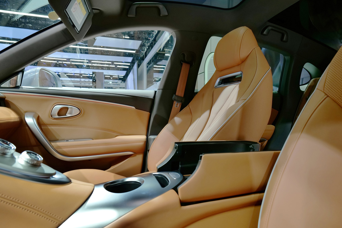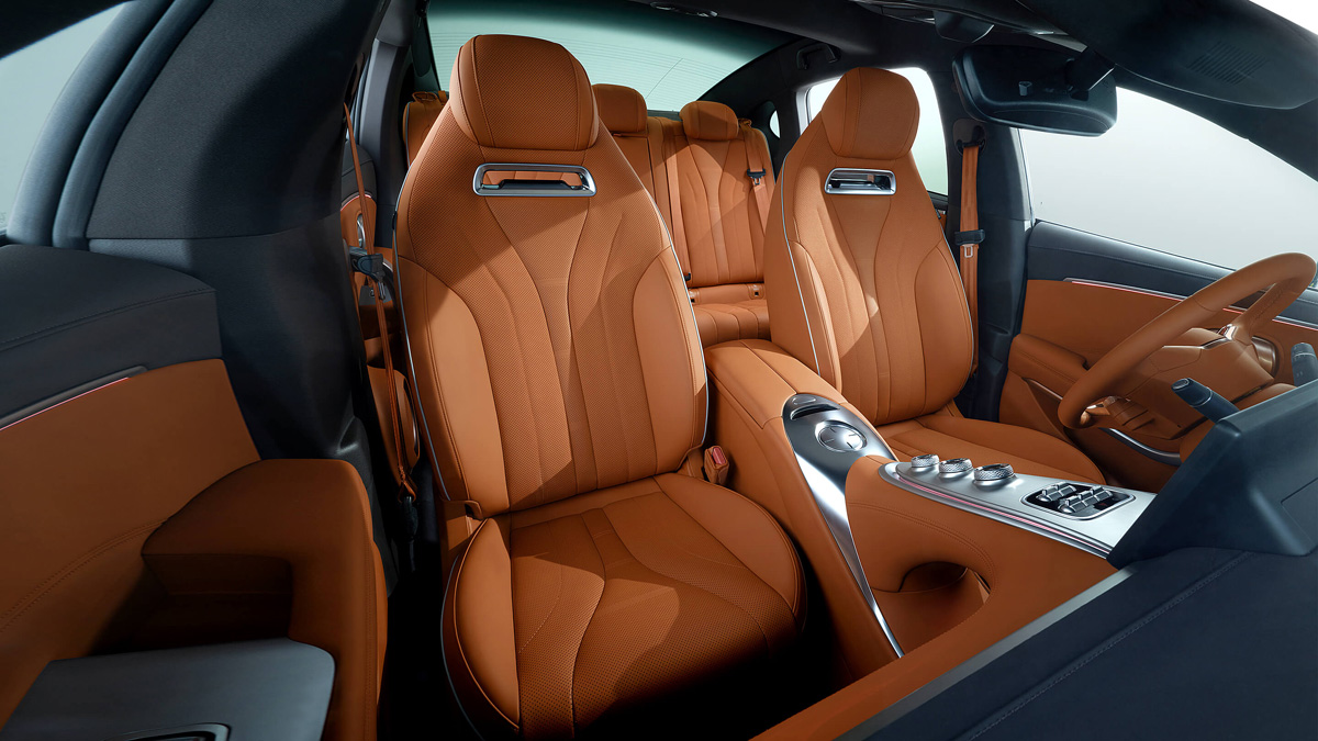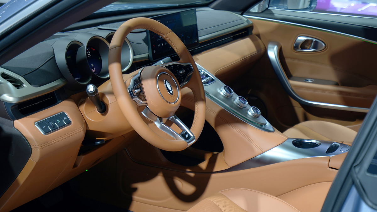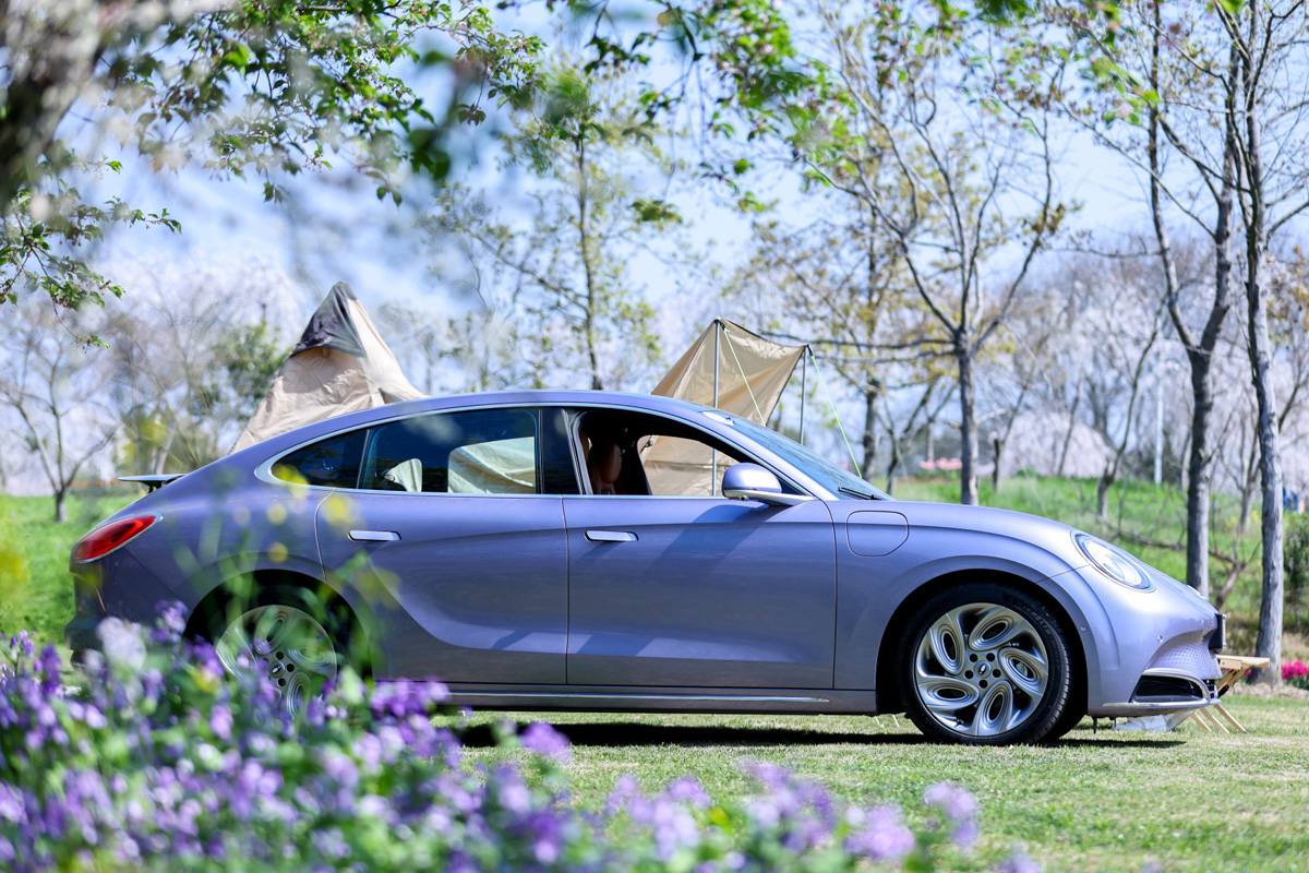 在外观的部分,这款车和好猫一样,都是使用了较为圆润的线条设计,包括了椭圆形的头灯组,保险杠设计等等,加以一点镀铬饰条点缀,让它的前脸看起来高贵又优雅,至于车侧则可以看到有隐藏式门把手,另外它还有跑车同款无框车门,还配备了造型独特的 19 寸的猫爪仿生镀铬轮圈和可升降尾翼,它会在 70 km/h 时自动升起,可以提供多 20 kg 的下压力,让它看起来更运动化,至于车尾则是大溜背的设计,配上和车头相呼应的椭圆形尾灯,整个设计就是 Coupe 轿跑车的感觉,而它的车漆颜色也很少女心,原厂提供了碧玺灰、烟紫晶、白璞玉和冰粉钻共 4 种车漆颜色可选。